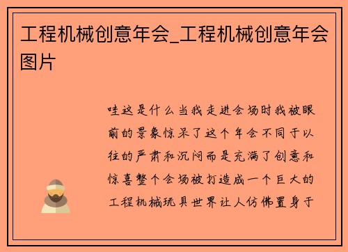 “哇,这是什么?!”当我走进会场时,我被眼前的景象惊呆了。这个年会不同于以往的严肃和沉闷,而是充满了创意和惊喜。整个会场被打造成一个巨大的工程机械玩具世界,让人仿佛置身于一个充满童趣的梦境中。 在这个...
